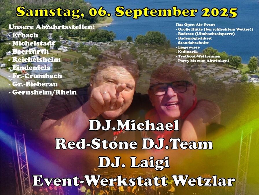 • Diskoparty mit (Red-Stone DJ.Team) und DJ. Laigi ein DJ. aus der Eventwerkstatt Wetzlar“ Disko-Party von 20:00 – 01:00 Uhr direkt auf der Seebühne.